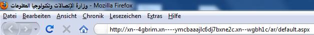http://موقع.وزارة-الأتصالات.مصر/. Da die meisten von uns diese Zeichen nicht mit der Tastatur eingeben können, gibt es natürlich auch eine lateinische Domain die auf den Namen http://xn--4gbrim.xn—-rmckbbajlc6dj7bxne2c.xn--wgbh1c/ hört. Gut zu merken 🙂