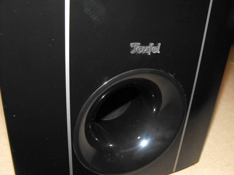 auf die höchste Einstellung dreht, knallt der Bass einem ganz schön um die Ohren und Einrichtungsgegenstände fangen auch an ein wenig im Takt mitzuwackeln. Dies wundert mich jedoch nicht, denn wenn ich mir den voluminösen Subwoofer anschaue, weiß ich wieso sich viele Bassfetischisten für Teufel entscheiden. Ein 200mm Tieftöner mit 135 Watt Leistung sind in dem Bassreflex-Holzgehäuse untergebracht. Man kann das Lautsprechersystem wahlweise mit einem Cinch-Stereoeingang betreiben oder wie der Name schon vermuten lässt über ein USB Kabel. Entscheidet man sich für die Verbindung via USB kommt die integrierte Soundkarte zum Einsatz und sorgt für sehr guten Sound. Der Cinch-Stereoeingang ist für MP3-Player oder Spielekonsolen gedacht. Der Subwoofer hat eine Abmessung von 24.7cm x 43.5cm x 38cm und wiegt 13 Kilo. Im Lieferumfang befindet sich auch eine sehr praktische kabelgebundene Tischfernbedienung die mit Gewichten bestückt ist um auch auf dem Schreibtisch nicht zu verrutschen. Mit der blau beleuchteten Tischfernbedienung kann man zum Einen die Lautstärke einstellen, aber auch den Bassanteil. Die aktuelle Lautstärke und der Bassanteil können an der Tischfernbedienung dank ebenfalls blau beleuchteter Statusbalken abgelesen werden. Ausserdem hat die Fernbedienung auch noch einen Frontanschluss für Kopfhörer und Mikrofon, was ungemein praktisch ist, da man nicht hinter den Subwoofer oder den PC herumwerkeln muss. Wie bereits vorhin erwähnt kann man durchaus eine kleine Hausparty mit der Anlage beschallen, was die Nachbarn sicherlich freuen wird (wenn sie eingeladen wurden ^^). Getestet habe ich Musik, Filme und Spiele. Zu keiner Zeit habe ich am Schreibtisch 5.1 vermisst. Wer den PC als Mediacenter einsetzt und viele DVDs und Blu-rays anschaut, der sollte sich dann wohl lieber ein 5.1 System wie das Teufel Concept E 200 zulegen.