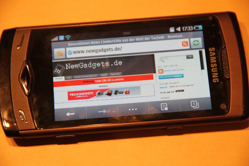 Full Internet Experience ist das was viele Anwender bei einem Smartphone wollen und bei dem Samsung Wave S8500 gibt es das auch. Webseiten können entweder in ihrer mobilen Version angeschaut werden (gutes Beispiel: Youtube) oder aber auch in der normalen Version, denn das S8500 unterstützt natürlich auch Java und Flash. Man kann Flashinhalte direkt auf der Seite anschauen, auch laufen diese teilweise recht flüssig. Dank Multitouch kann man schnell Webseiten vergrößern oder verkleinern und selbstverständlich sind auch mehrere Tabs möglich. Emailempfang ist natürlich kein Problem. Für Social Media ist auch gesorgt, so sind Apps für Facebook und Twitter bereits vorinstalliert und können sofort genutzt werden. Was mir persönlich gut gefallen hat, war das Speichern der Logins. Man hat sich einmal in den Facebook und Twitter Apps eingeloggt und war dann beim nächsten Starten der App direkt wieder angemeldet. Über Profile im Hauptmenü kann man sich natürlich auch wieder ausloggen, aber ich empfand es als sehr komfortabel.