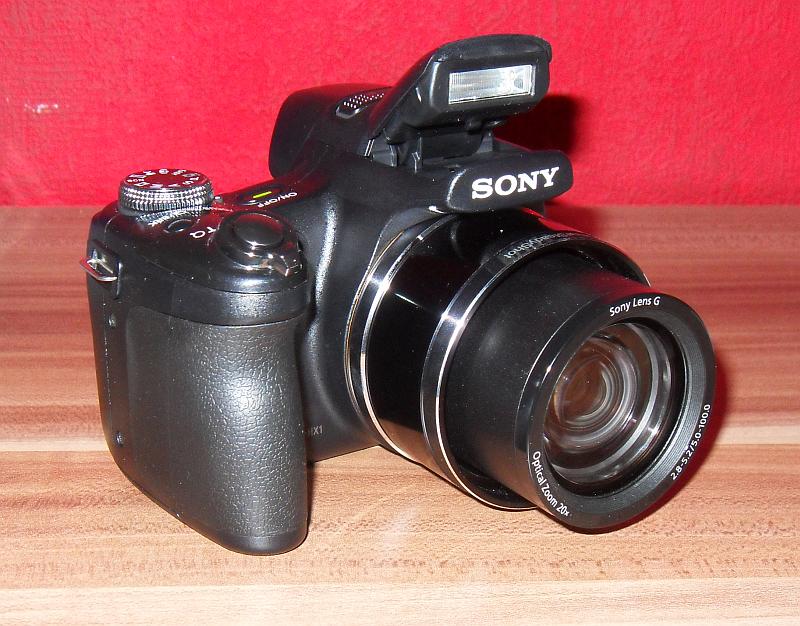 Der optische Ersteindruck der Sony DSC-HX1 ist positiv, man hält eine äußerst ansehnliche Kamera in der Hand, die mehr den Eindruck einer sehr kompakten Spiegelreflex hinterlässt. Das Gewicht ist trotz ihrer kompakten Bauweise ausreichend. Dadurch liegt die Kamera sehr gut in der Hand.Dank dem besonders großzügigen, mit Kunstleder bezogenen Handgriff rechter Hand hat man die HX1 in jeder Situation gut im Griff. Das Gehäusematerial wirkt nicht ganz so hochwertig wie die durchweg sehr gute Optik. Haptisch wirkt der Kunststoff ein bisschen billig, zudem ist beim Bedienen einiger Tasten ein hohles Geräusch vernehmbar. Auch sind die Druckpunkte einiger Tasten verbesserungswürdig.