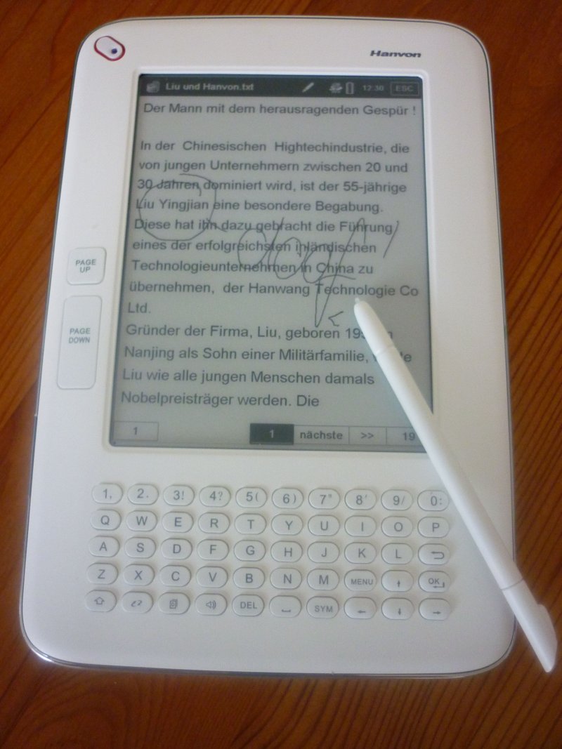Eine sehr nützliche Funktion des Hanvon sind die Text-Anmerkungen: dank des Touchscreens können wichtige Stellen in Ebooks direkt markiert oder annotiert werden. Und die integrierte Volltextsuche in Ebooks ist gerade in Fachbüchern unersetzlich: Der Reader springt sofort zur nächsten Fundstelle des Suchbegriffs und erspart so langwieriges Querlesen, was wir beim Sony PRS 300 noch bemängelt hatten.