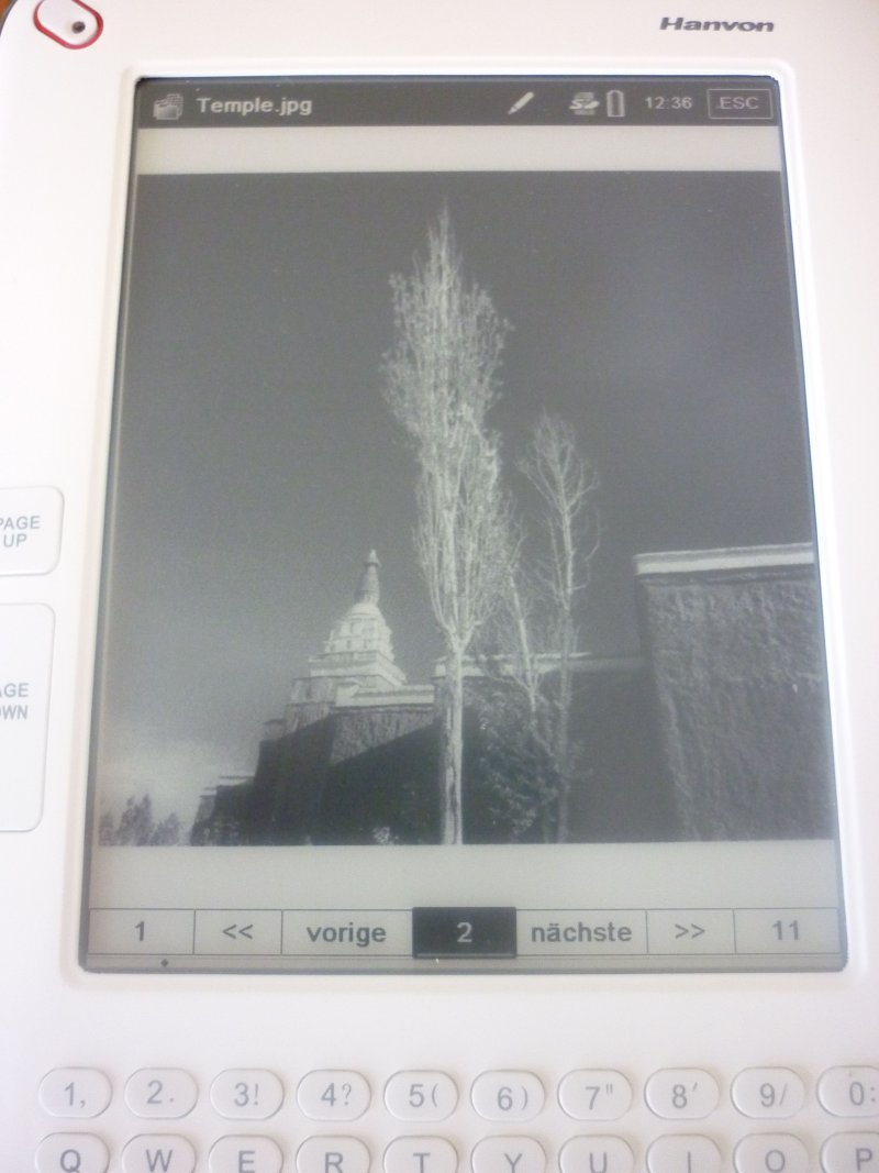 Der eingebaute Bildbetrachter des Hanvon ist letztlich nicht mehr als ein nettes Gimmick: Der Bildschirm mit einer Auflösung von 800×600 Pixeln und acht Graustufen eignet sich bestenfalls für Schwarz-Weiß-Bilder oder –Comics. Schade, dass der Reader nicht auch die Comic-Formate CBR und CBZ unterstützt.