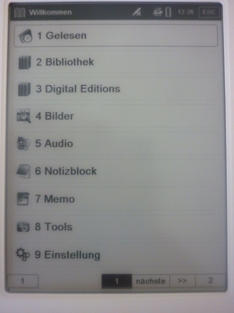 Dreh- und Angelpunkt eines Ebook-Readers sind natürlich die Fähigkeiten als Lesegerät. Und hier kann der Reader überzeugen: Das Schriftbild ist jederzeit gestochen scharf und flimmerfrei, wie es bei E-Ink üblich ist. Insgesamt wirkt der Bildschirm ein wenig gelblicher als beim Sony, aber der Unterschied ist nur im unmittelbaren Vergleich zu sehen.