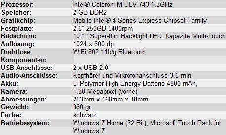 Dank des Intel Celeron ULV 743 mit 1,3GHz können auch 1080p Videos auf dem 10,1-Zoll kapazitiven Touchscreen mit einer Auflösung von 1024 x 600 abgespielt werden. Als Betriebssystem wird Windows 7 eingesetzt und dank dem Microsoft Touch Pack für Windows 7 können auch Multitouch Gesten angewandt werden, denn das Touchscreen ist natürlich multitouchfähig. Da mein Kollege JKK und die Jungs von PTPT bereits seit einiger Zeit ein Testexemplar des Touchpad B10 haben, konnte ich auch schon seit einigen Wochen mit dem Gerät arbeiten, ich empfand es als sehr gut verarbeitet und auch angenehm schnell. Wie lange der eingebaute 4800mAh Akku halten wird, werde ich euch bald berichten können, denn ein Testgerät ist bereits auf dem Weg zu mir.