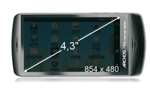 Der Archos 43 ist ein 4,3-Zoll Tablet hat ein resistives Touchscreendisplay mit einer Auflösung von 480 x 854 Pixeln (FWGA), es wird eine 8GB und 16GB Version geben und man kann mit dem Tablet 720p Videos drehen. Man soll auch bis zu 12 Stunden damit surfen können.