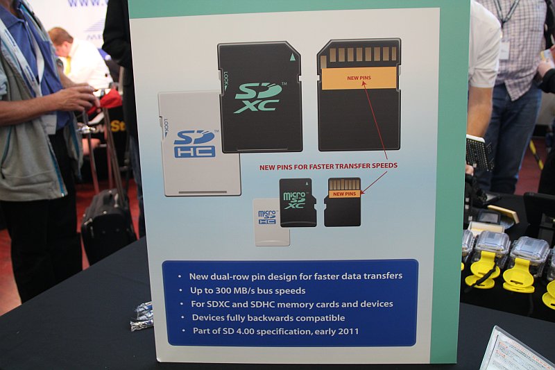 Die Nachfolger der beliebten SDHC, die SDXC (SD eXtended Capacity), wurden 2009 auf der CES in Las Vegas vorgestellt und kommen nun so langsam auf den Markt. Es gibt auch immer mehr Geräte die diese unterstützen, wie beispielsweise meine Canon EOS 550D (kaufen). Auf dem ShowStoppers Event auf der IFA zeigte die SD Association bereits was als nächstes geplant ist. Neben den Speichergrößen die bei SDXC möglich sind (bis zu 2TB) will man nun auch bald eine zweite Reihe an Pins einführen und somit die Geschwindigkeit signifikant erhöhen. Dank der zweiten Pinreihe sollen dann Geschwindigkeiten von bis zu 300MB/s möglich sein. Wie man auf dem zweiten Bild sehen kann wird diese Änderung auch microSD Karten betreffen. Diese neuen SD-Karten sind aber immer noch abwärtskompatibel. Die zweite Pinreihe wird im Rahmen der SD 4.0 Spezifikation eingeführt, die Anfang 2011 vorgestellt werden soll.