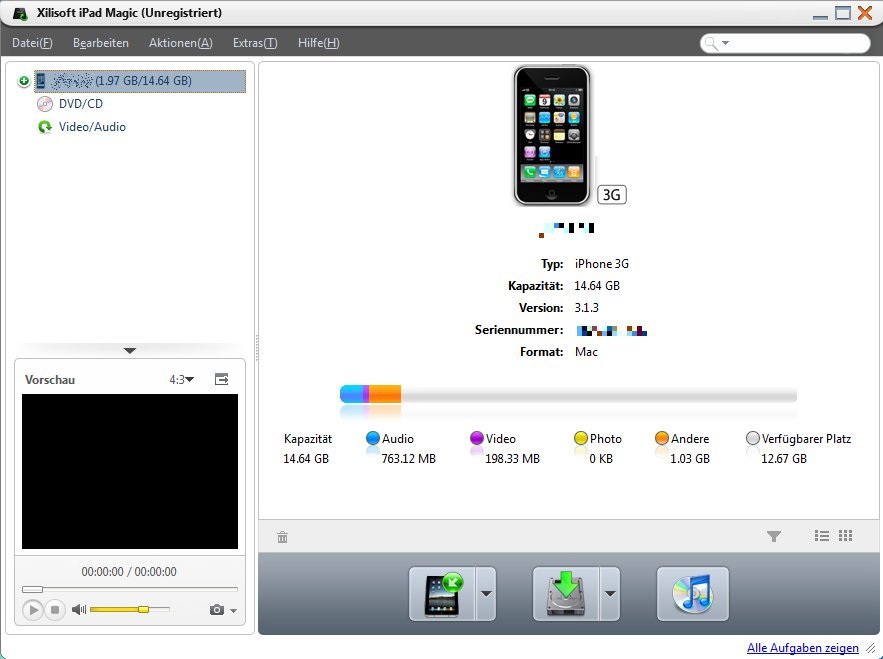 Natürlich gibt es auch ein paar Unterschiede zwischen der Gratisversion und der Kaufversion. Möchte man beispielsweise Videodateien transferieren, müssen diese vorher konvertiert werden, sollten sie nicht das passende Format besitzen. In der kostenlosen Version sind Videos auf drei Minuten beschränkt, wer kürzere Videos hat kann sich freuen, bei längeren Videos wird dann entsprechend der Inhalt nach drei Minuten abgeschnitten. Die Kaufversion schlägt mit 49,95€ zu Buche, da es sich aber um Software handelt entfallen Versandkosten und man erhält nach dem Kauf einen Lizenzschlüssel um die Gratisversion in eine Vollversion zu verwandeln.