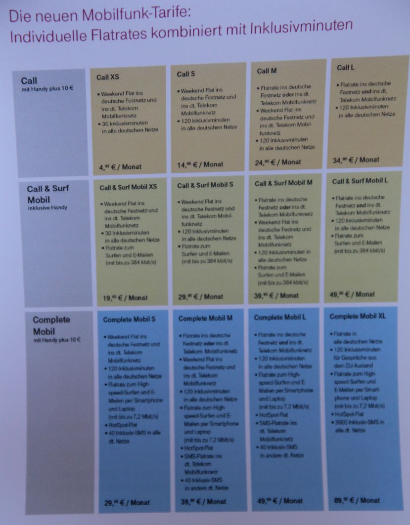 Die Telekom hat soeben in Hamburg neue Mobilfunktarife vorgestellt, die vorallem die Kunden an das mobile Internet heranführen sollen. Bevor ich nun alles abtippe, habe ich für euch ein paar Slides die die neuen Tarifgruppen „Complete Mobile„, „Call & Surf Mobil“ und „Call“ vorstellen. Die neuen Tarife werden ab dem 3. November eingeführt. Es sind schon ein paar interessante Tarife dabei. Die jeweiligen Tarife mit ihren Details und Preisen findet ihr hier.