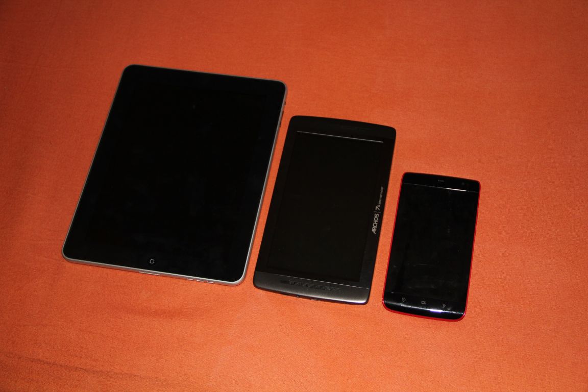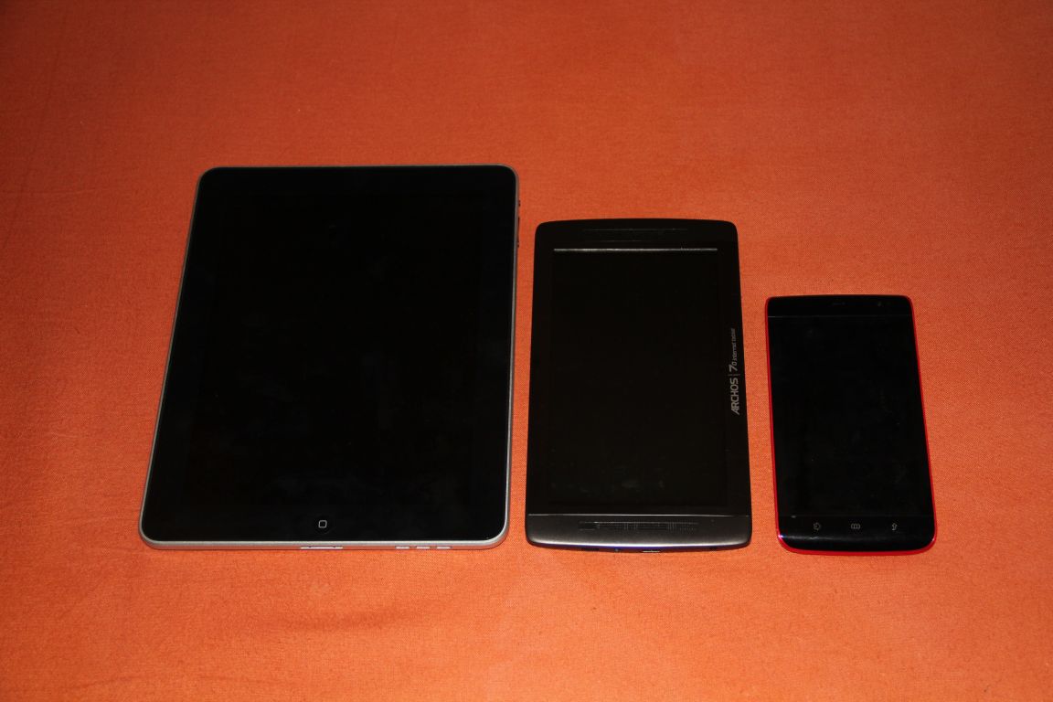 Da in den Kommentaren nach einem Größenvergleich des Archos 7.0 Internet Tablet mit anderen Tablets gefragt wurde, habe ich einmal das Dell Streak, das Apple iPad und das Apple iPhone geschnappt und ein paar Bilder gemacht und hochgeladen.