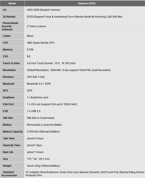 Das xpPhone lässt sich hier in Deutschland leider nicht als Telefon benutzen, sondern nur über UMTS als MID, wobei dies durch die Slidertastatur sicher auch genug Spass macht. Nur der Preis ist etwas hoch verglichen mit anderen Geräten. Dank USB 2.0 können auch USB-Sticks und Zubehör angeschlossen werden und dank VGA ist auch die Videoausgabe gesichert.