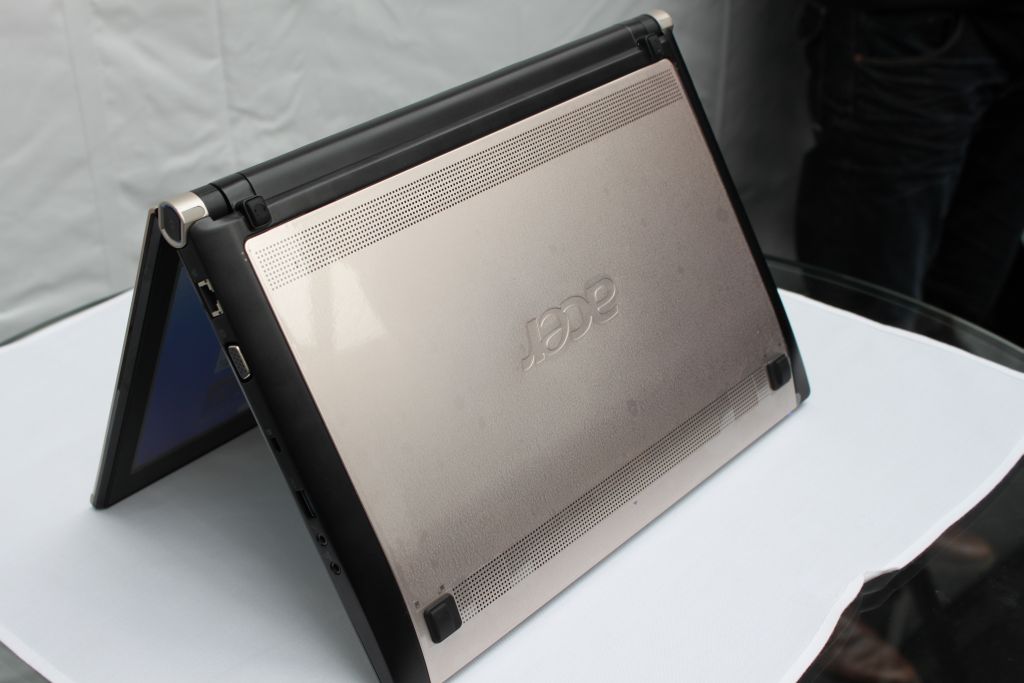 st dieses Jahr hat MSI solch eine Idee vorgestellt und auch Toshiba hat mit seinem Libretto W100 diese Idee aufgegriffen und das Produkt auch schon seit einiger Zeit im Handel. Die Idee von MSI und Toshiba wurde aber immer mit recht kleinen Displays gelöst. Acer zeigt aber nun dass man es auch etwas größer realisieren kann. Auch wird dank eines Intel Core i5 die Performance etwas höher sein. Zur Akkulaufzeit kann man derzeit noch nicht viel sagen, sie wird aber erwartungsgemäß nicht sonderlich hoch werden, denn der Platz im Notebookgehäuse wird ja schon zum größten Teil von den Displays eingenommen. So kommt hier ein 4-Zellen Akku (3000mAh , 44Wh) zum Einsatz, der laut Acer 3 Stunden durchhalten soll, meiner Meinung nach viel zu wenig Laufzeit. Diese Laufzeit liegt an den beiden Displays und der restlichen Hardware wie dem Intel Core i5 mit 2,66GHz, somit hat man dann ein Notebook mit guter Leistung aber geringer Akkulaufzeit, hier muss jeder selbst entscheiden was ihm wichtiger ist.