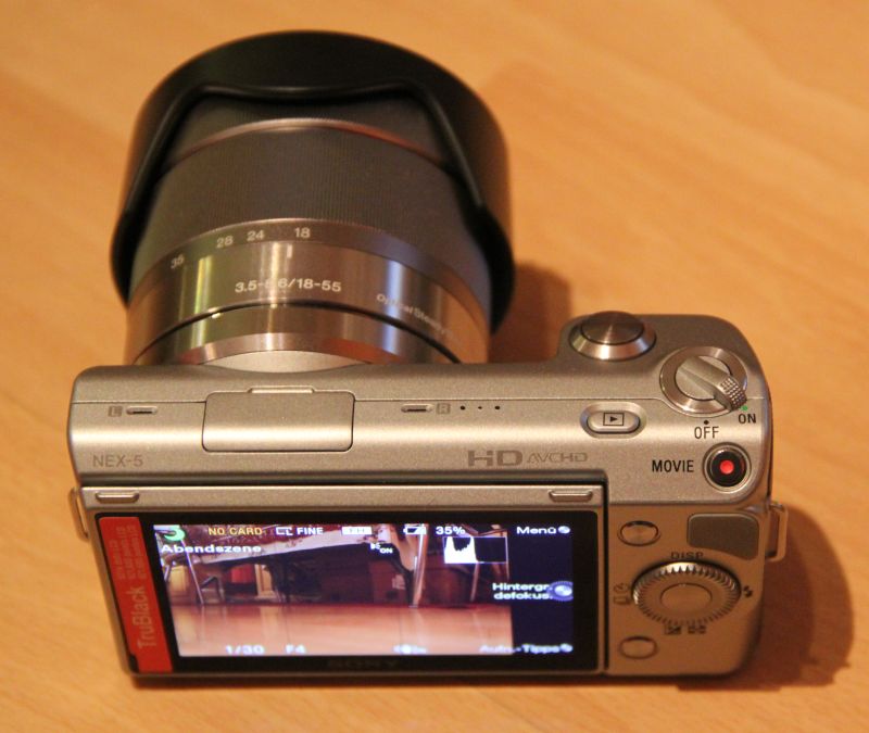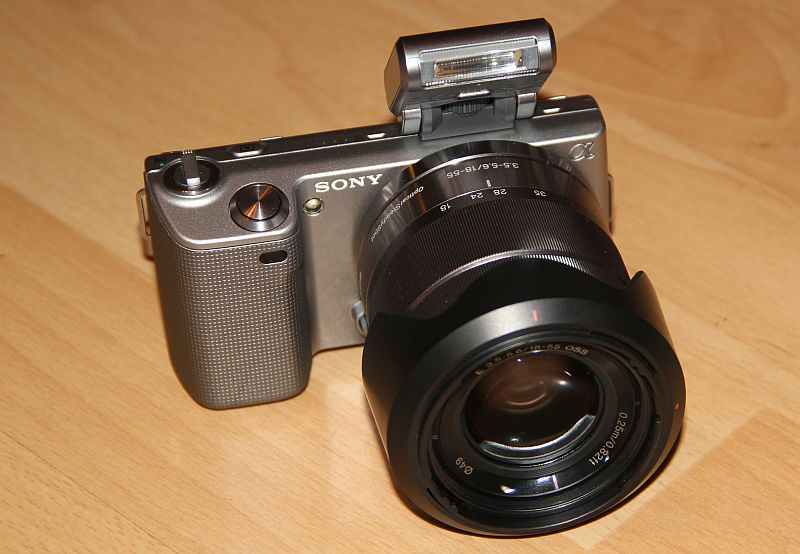 Objektiv vorausgesetzt, sehr gut einhändig bedienen. Mit dem mitgelieferten 16mm Pancake-Objektiv funktioniert das sehr gut, das 18-55mm ist schon wieder etwas zu schwer. Für die nötige Erleuchtung in dämmrigen Momenten sorgt ein Aufsteck-Blitz, welcher nach Feststellen der Fixierschraube bombenfest sitzt. Der Blitz kann dann auf und zu geklappt werden. Leider hat Sony nicht an einen genormten Blitzschuh gedacht. Die Kamera unterstützt sowohl SD-Karten als auch Memory Sticks. Insgesamt macht die NEX-5 beim Bedienen einen hochwertigen Eindruck.