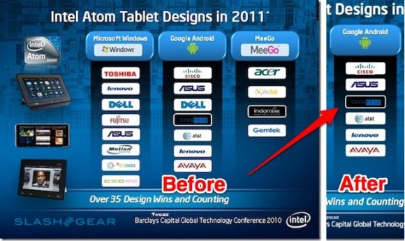 Intel erwartet für 2011 eine Menge neuer Tablets, um genau zu sein ungefähr 35. Und ich vermute mal wir werden rund die Hälfte bereits am Jahresanfang in Las Vegas auf der CES 2011 zu sehen bekommen. Wie man an dem Schaubild sehen kann sind die namhaften Hersteller alle vertreten, nur leider sind es sehr viele Windows Tablets und vergleichsweise wenige Android und MeeGo Tablets, obwohl diese beiden Betriebssystem einfach besser für den Tabletbetrieb ausgelegt sind. Auch zeigt das Bild das Dell mysteriöserweise nicht mehr unter den Android Tablets gelistet ist. Entweder hat sich Dell gegen ein gutes Betriebssystem entschieden oder Dell möchte uns auf der CES 2011 überraschen, wer weiß.