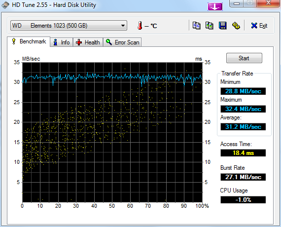 Hier habt ihr noch zwei Benchmarkergebnisse von den gängigsten Festplattentools HDTune und Bench32. Die Platte erreicht über USB 2.0 bei mir eine Geschwindigkeit von ca. 30MB/s lesend und ca. 27MB/s schreibend und ist somit schnell genug für den täglichen Gebrauch.