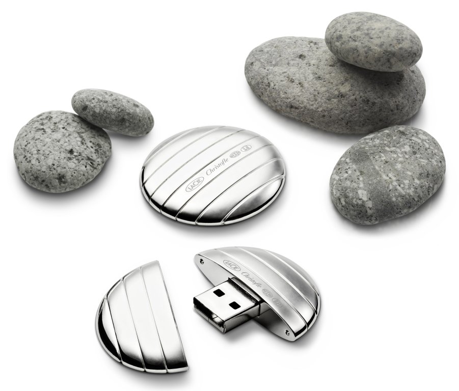 Christofle, bekannt durch Tafelbesteck und Schmuck aus Silber und LaCie, bekannt durch Speicherlösungen mit besonderem Design, haben zusammen einen versilberten Designer USB-Stick vorgestellt. Der auf Galet getaufte USB-Stick sieht auf jeden Fall sehr edel aus.