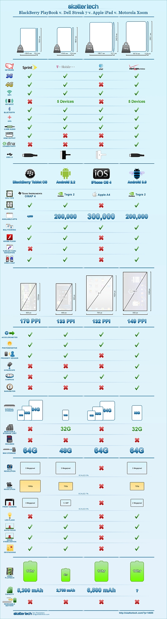 Die Kollegen von Skattertech haben sich wirklich eine Menge Mühe gemacht diese Infografik für uns zu erstellen. Sie zeigt vier Tablets, die miteinander verglichen werden. Es sind zwei 7-Zoll Tablets (BlackBerry PlayBook und Dell Streak 7) und zwei 10-Zoll Tablets (Apple iPad und Motorola Xoom) gegenüber gestellt. Man kann gut sehen welche Features dem ein oder anderen Tablet fehlen bzw. welches Tablet die besten Features hat. Man kann auch erkennen, dass das Dell Streak leider mit 2700mAh den wohl kleinsten Akku verbaut haben wird, was sich natürlich auch auf die Akkulaufzeit auswirkt und dem Tablet die schlechteste Akkulaufzeit dieser vier Tablets beschert.