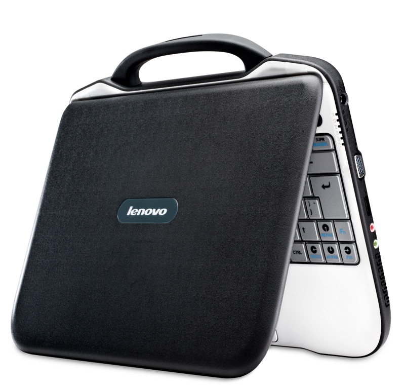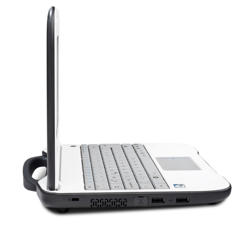 Und es geht weiter mit dem Intel Classmate PC. Nun hat der Displaydeckel ein Lenovo Logo, denn Intel und Lenovo haben zusammen den Classmate+ PC vorgestellt. Hierbei handelt es sich um ein 10.1-Zoll Netbook mit Intel Atom N455 Single-Core Prozessor und Windows 7 als Betriebssystem, wie man anhand des Datenblattes erkennen kann gibt es viele Ausstattungsvarianten, so hat man beispielsweise die Wahl welche Version von Windows 7 verwendet werden soll oder wieviele Zellen der Akku hat. Natürlich darf auch die Trageschlaufe nicht fehlen, denn die Kinder müssen das Notebook ja auch noch umhertragen.