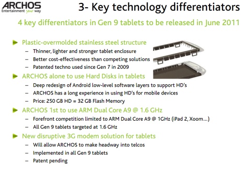 Man möchte auch weiterhin auf Festplatten setzen, den Tablets sind nun mal Multimediageräte und da reichen manchmal die eingebauten 16GB oder 32GB nicht. Der Preis einer 250GB Festplatte ist in etwa vergleichbar mit dem Preis von 32GB Flashspeicher. Archos wird auch als erster Hersteller einen ARM Dual-Core A9 mit 1,6GHz verbauen, alle Gen 9 Tablets sollen mit diesem Prozessor ausgestattet werden. Auch will Archos nun den Schritt in Richtung UMTS (3G) wagen, denn bisher hatte noch kein Archos Tablet UMTS.