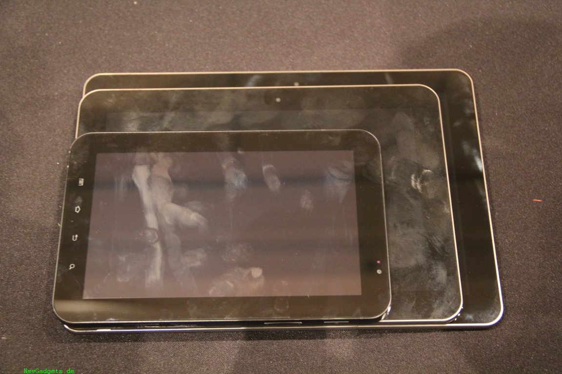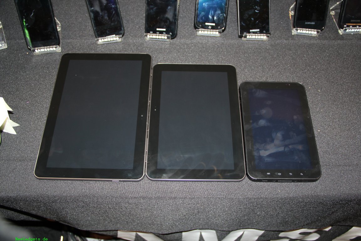 Ich hatte die Möglichkeit alle drei Samsung Galaxy Tabs auf ein Foto zu bekommen. So sieht man auch deutlich den Größenunterschied zwischen den beiden neuen, nur 8.6mm dicken Tablets und dem etwas älteren Samsung Galaxy Tab (7-Zoll). Auf den Bildern sind also die beiden neuen und dünnen Modelle des Samsung Galaxy Tab 10.1 und Samsung Galaxy Tab 8.9 und das Samsung Galaxy Tab 7.
