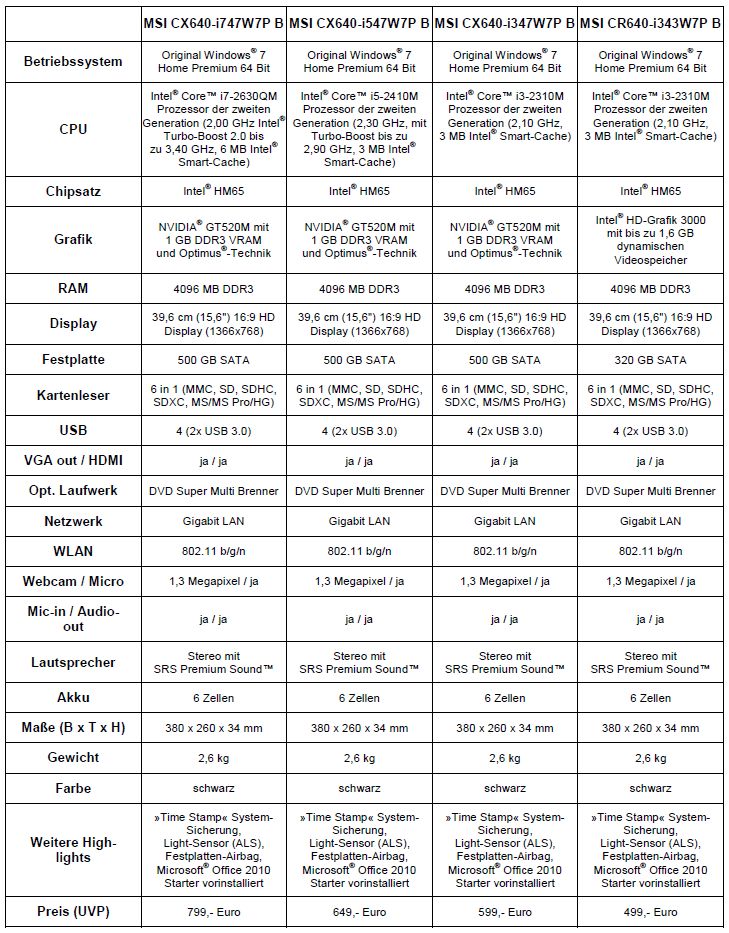 Es wird mehrere Ausstattungsvarianten geben um so auch in fast allen Preisklassen Geräte anbieten zu können. Das High-End Modell wird mit einem Intel Core i7-2630QM ausgestattet sein und eine NVidia GeForce GT520M mit 1GB DDR3 VRAM einsetzen um für die nötige Power unterwegs zu sorgen. Mit NVidia Optimus wird dann dynamisch zwischen interner Grafik und der Grafikkarte umhergeschaltet um Akkulaufzeit zu sparen. Alle Modelle werden über 4GB DDR3 Arbeitsspeicher, Kartenleser, VGA- und HDMI-Anschluss, WLAN 802.11b/g/n, Gigabit LAN, 1.3-Megapixel Kamera und 6-Zellen verfügen, alle CX640 Modelle haben eine 500GB und die NVidia GeForce GT520M. Das MSI CR640, das preisgünstigste Modell verfügt dann über einen Intel Core i3-2310M und die interne Intel HD 3000 Grafiklösung (die auch für das ein oder andere Spiel geeignet ist, siehe mein StarCraft 2 Video). Für die genauen Ausstattungsvarianten schaut ihr euch am besten unten die Grafik an, dort sind alle in Deutschland verfügbaren Modelle mit ihren technischen Daten und Preisen aufgelistet.