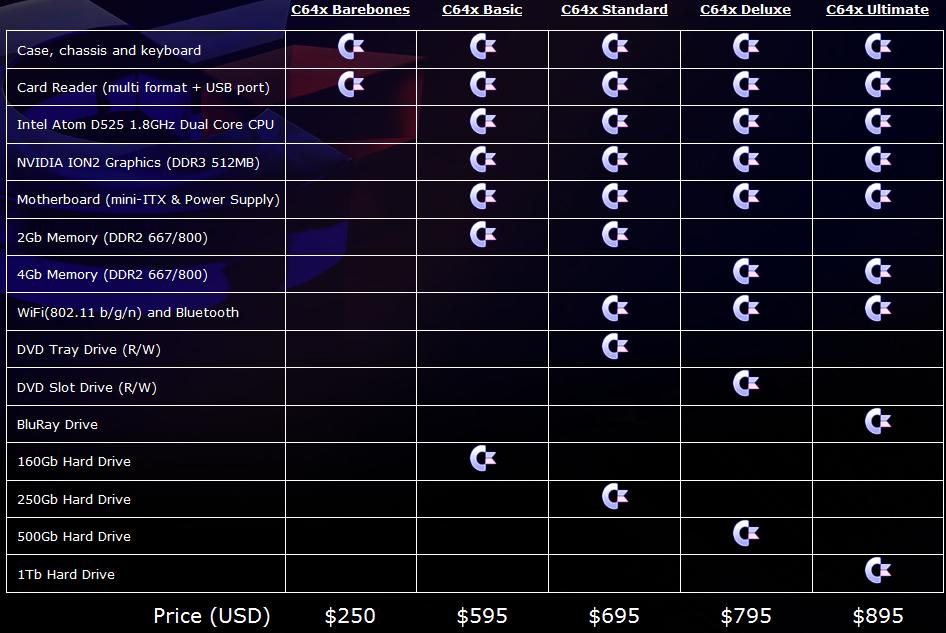 Man kann sich den C64x als Barebone (nur Gehäuse ohne Motherboard etc.) zulegen und das für 250$ oder als High-End Version C64x Ultimate mit 1TB Festplatte, Blu-ray Laufwerk und 4GB Arbeitsspeicher für 895$ Dazwischen gibt es noch einige Ausstattungsvarianten, dazu schaut ich euch am besten die Grafik hier unten an. Man kann sich den C64x schon vorbestellen, direkt auf der Seite von Commodore.