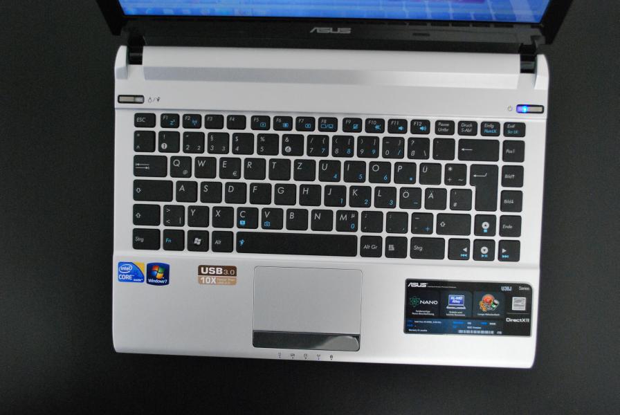 Zuerst fällt dem Betrachter bei diesem Gerät eines auf: 19mm Höhe, 1,7kg Gewicht. Das sieht nicht nur gut aus, sondern fühlt sich auch gut an – nämlich beim Tragen. Das Asus U36JC ist als mobiler Begleiter gedacht und fast alles ist dementsprechend hergestellt. Auf zusätzliche und experimentelle Gimmicks wurde verzichtet und alles sitzt am Platz. Nicht klappert, nichts rattert, alles sitzt fest im Gehäuse. An dieser Stelle weiß der Hersteller auch mit der Chiclettastatur zu überzeugen. Diese lässt sich an keiner Stelle eindrücken und lässt sich auch sehr angenehm tippen. Die Druckpunkte sind gelungen und FN-Taste sitzt zwischen der STRG- und Windows-Taste.