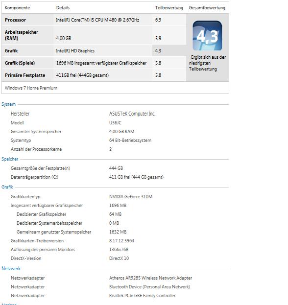 Die Performance des U36JC möchten wir anhand des Prozessors, der Grafikleistung und des Akkus etwas genauer betrachten. Der Windows-Leistungsindex ist zwar nicht die detaillierteste Quelle, dennoch spiegelt sie ganz gut das Gesamtbild wieder. Die 4,3 bei der Grafikleistung liegt wohl mit der im Normalgebrauch deaktivierten Nvidia Grafikkarte zusammen.