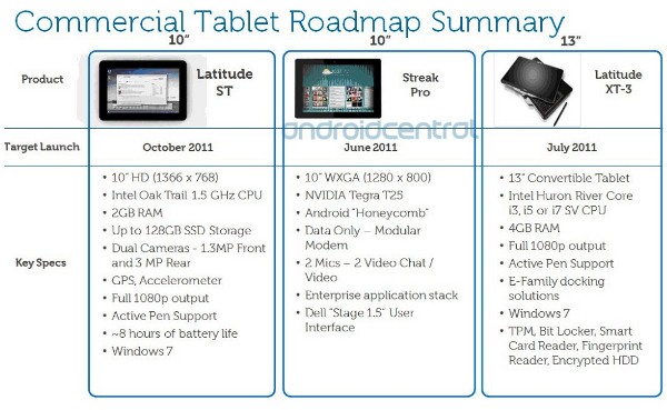 Als Betriebssystem wird dann Android Honeycomb zum Einsatz kommen, bis Juni werden die Android 3.0 Problemchen sicher auch behoben sein. Über Android wird dann die Benutzeroberfläche Dell Stage in der Version 1.5 installiert sein. Im Juli soll dann das Dell Latitude XT-3 erscheinen, ein 13-Zoll Convertible Tablet, ausgestattet mit „Huron River“ Intel Core i3, i5 oder i7 Prozessor, 4GB Arbeitsspeicher, 1080p Videoausgabe. Vor allem für Studenten und Geschäftsleute interessant ist der Support für einen aktiven Stylus. Natürlich ist dann Windows 7 das Betriebssystem. Und last but not least sollen wir dann im Oktober 2011 ein 10-Zoll Intel Oak Trail Tablet auf den Markt bringen, das Dell Latitude ST. Die Auflösung soll 1366×768 Pixel betragen. 2 GB Arbeitsspeicher und bis zu 128GB SSD-Speicher sind möglich. Zwei Kameras sind dabei, eine 1.3-Megapixel vorne und eine 3-Megapixel Kamer auf der Rückseite. Auch das Tablet wird einen aktiven Stylus unterstützen. Mit ungefähr 8 Stunden Akkulaufzeit dürfen wir wohl rechnen und dank Windows 7 wird es auch ein Tablet, welches auch für Unternehmen interessant werden dürfte.