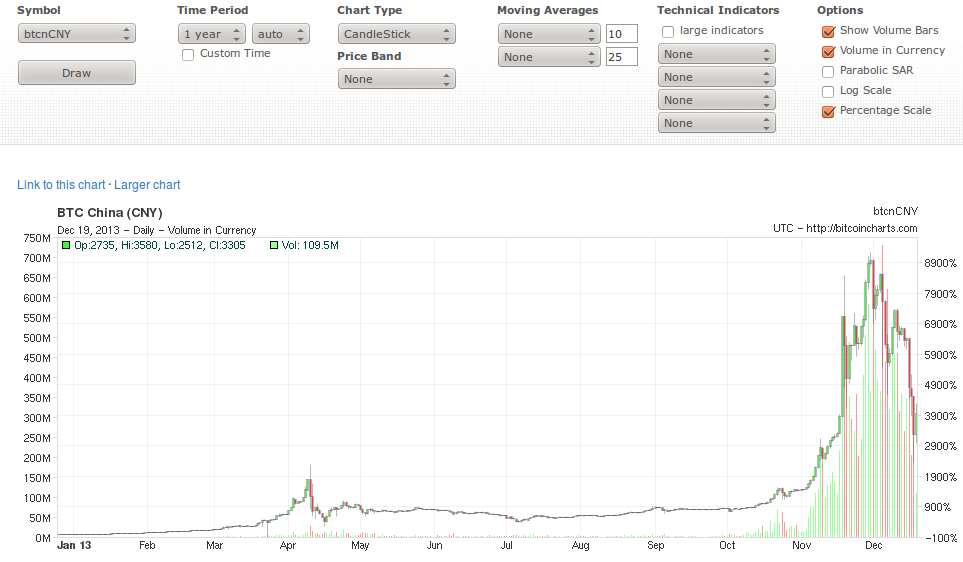 Wer die erste Warnung der chinesischen Notenbank nicht ernst genommen hattte, wurde dann spätestens vorgestern eines Besseren belehrt, denn an diesem Tag wurde den institutionellen chinesischen Anlegern die Annahme von Yuan im Tausch gegen Bitcoins verboten. Der größte Händler, Yeepay, teilte per Pressemitteilung mit, ab sofort keine Yuan mehr gegen Bitcoins annehmen zu können, was auch von der „Dachorganisation“ BTC China bestätigt wurde. Der Kurs rauschte daraufhin um etwa die Hälfte in den Keller, was einem vorherigen Zugewinn von mehreren tausend Prozent entspricht.