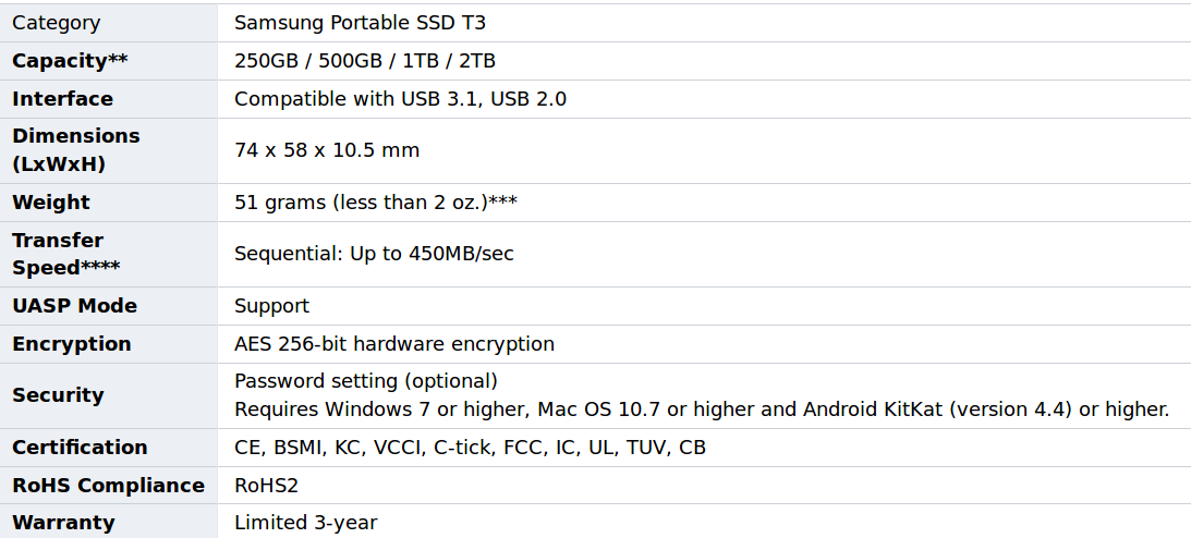 Samsungs SSD T3, nunmehr eben schon die dritte ihrer Serie, weiß außerdem mit einem sehr geringen Gewicht (ab 51 Gramm), variablen Kapazitäten (250, 500, 1000, 2000 GB) und einer Bauhöhe von nur 10,5 cm zu glänzen. Den Angaben zufolge ist eine Schreibgeschwindigkeit oberhalb der 450 MB/sec zu erwarten, wobei nicht genannt wird, ob dabei auch die AES 256-bit hardware encryption aktiviert sein darf.