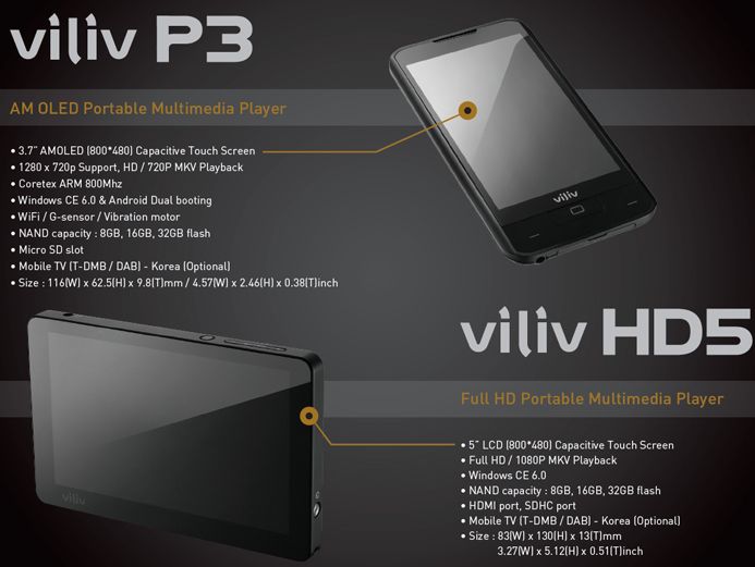 Wer sich jetzt gefreut hat, dass das Viliv HD5 ein neue 5-Zoll Tablet-PC von Viliv ist, den muss ich leider enttäuschen. Das Viliv HD5 ist ein Multimediaplayer mit Full HD Support, HDMI-Ausgang, kapazitivem Touchscreen und optionalem (nur in Korea verfügbaren) Mobile TV. Als Betriebssystem im Hintergrund kommt Windows CE 6.0 zum Einsatz, es wird aber natürlich ein Benutzerfreundliches Mediaplayer Frontend geben.