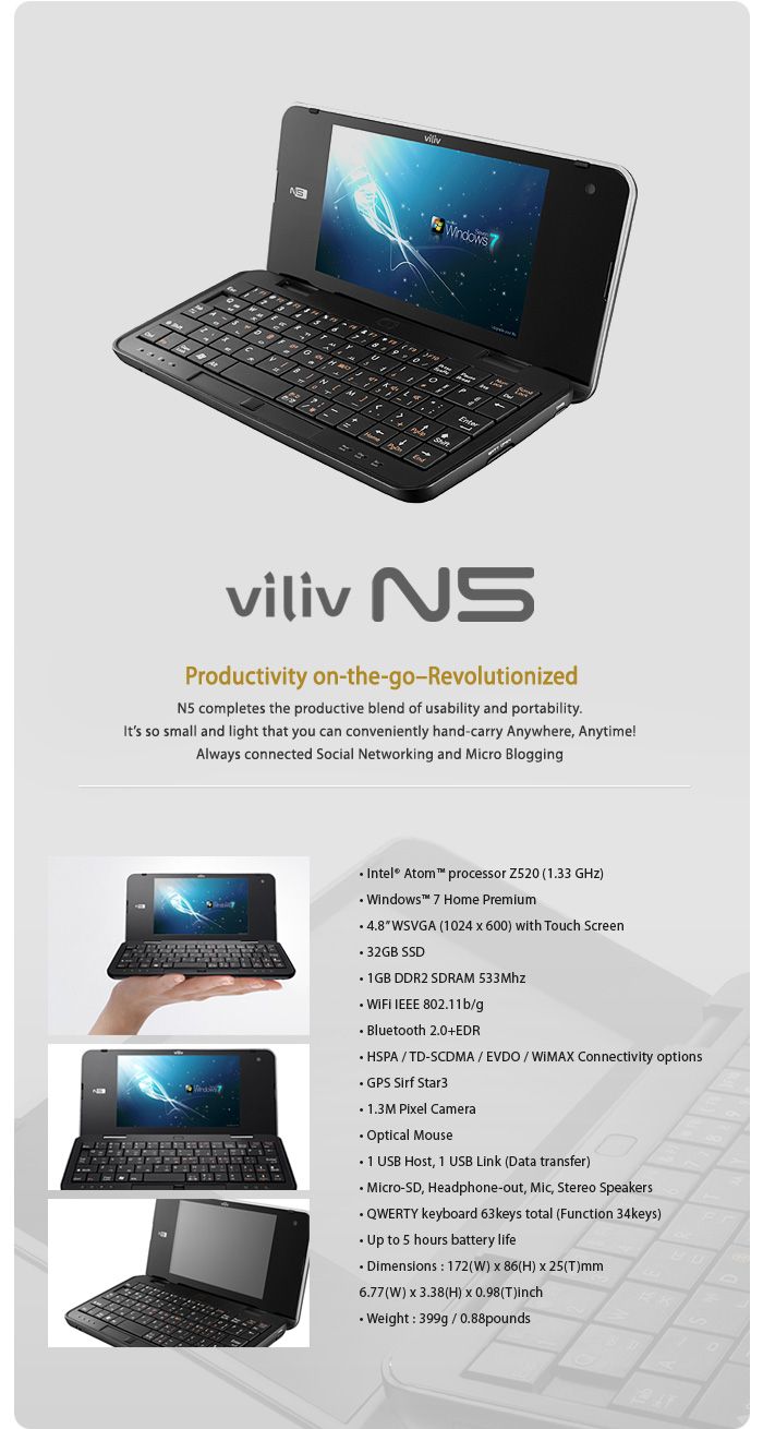Ich weiß das hier einige unter den Lesern sitzen, die das Viliv N5 genauso gern haben wie ich. Und deshalb habe ich hier weitere Informationen und Bilder und zwar die genauen technischen Daten des Viliv N5 und zwei hochauflösende offizielle Produktbilder des kleinen UMPC. Aber zuerst nochmal mein Hands On von der CES, für alle die das Viliv N5 noch nicht kennen.